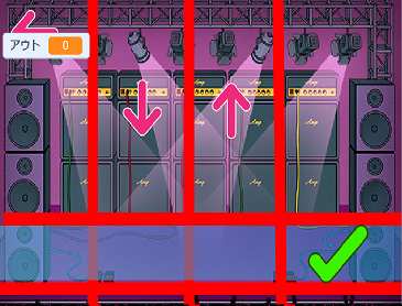 このゲームは上4つの欄から矢印がおりてきます、落ちてきましたら右の場合(右矢印の場合)はゲーム画面に少し青い欄があると思います、青い欄に触れる時に右矢印キーを押していただくとチェックが出ると思いますそしたらセーフです、もし矢印キーが押せなかった場合バツが出ると思いますそしたらアウトです、アウトが20回になるとゲームオーバーです。