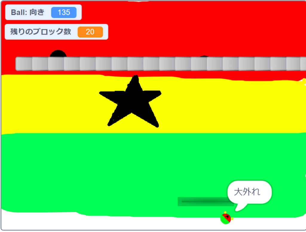 ブロック崩し 2025年2月22日 最終更新日時 : 2025年2月22日 abehiro 旗ボタンを押してその後にマウスを動かしてボールを落とさないようにするゲーム それでブロックを全部壊したら完璧と言う もし落ちたら大外れと言う それで終わり
