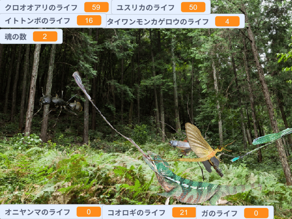 カメレオンゲーム 2026年1月11日 最終更新日時 : 2026年1月11日 abehiro 千葉遼大です。 4年生 遊び方はマウスにカメレオンがついていき、カメレオンに当たると虫の体力が減って、虫の数字が0になると虫が消えます。 難しかったところは虫たちが動くようにしたり、虫たちの体力などがおかしくならないように頑張りました。