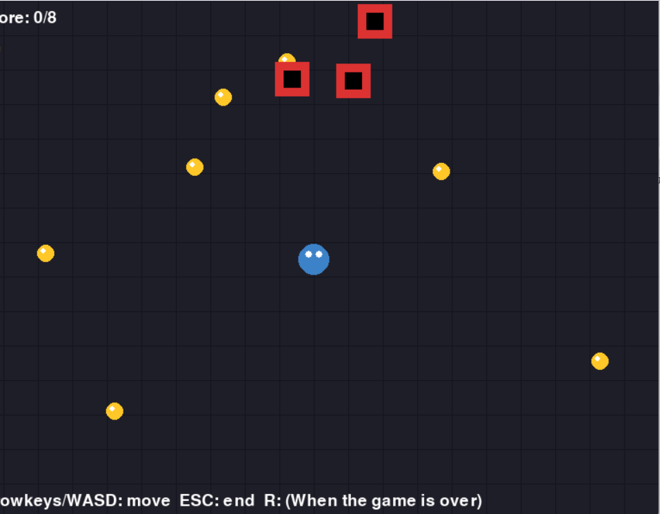点集めゲーム HP 2025年11月23日 最終更新日時 : 2025年11月23日 abehiro 敵から逃げて点【・】集めるゲームです 工夫した点はプログラムを短くするのを目標にしたため敵の動きを追尾ではなく反射にした事です