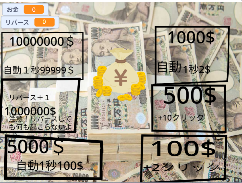 お金持ちになろう! 2025年12月14日 最終更新日時 : 2025年12月14日 abehiro みなみれおんです。 お金をクリックしてお金を集めるゲームで、例えば100$使えば1っ回のクリックにつき2$もらえるようになっていきます。そして自動の機能もあります。リバースは、しても特に何も起こりませんが回数が増えていきます。